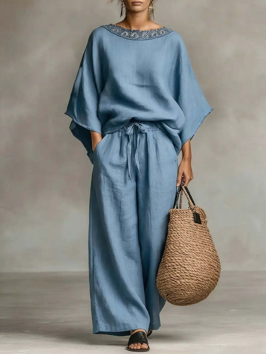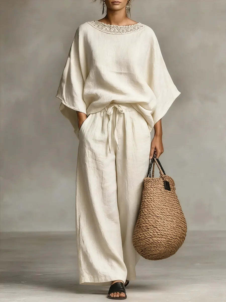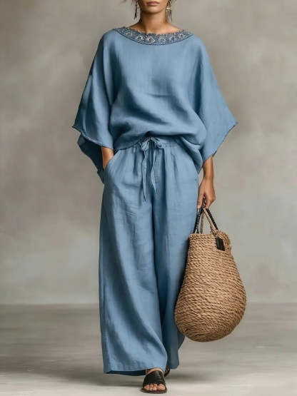 Plus Size Friendly Women’s Batwing Sleeve Linen Cotton Two-Piece Set – Casual Shirt & Wide Leg Pants Outfit